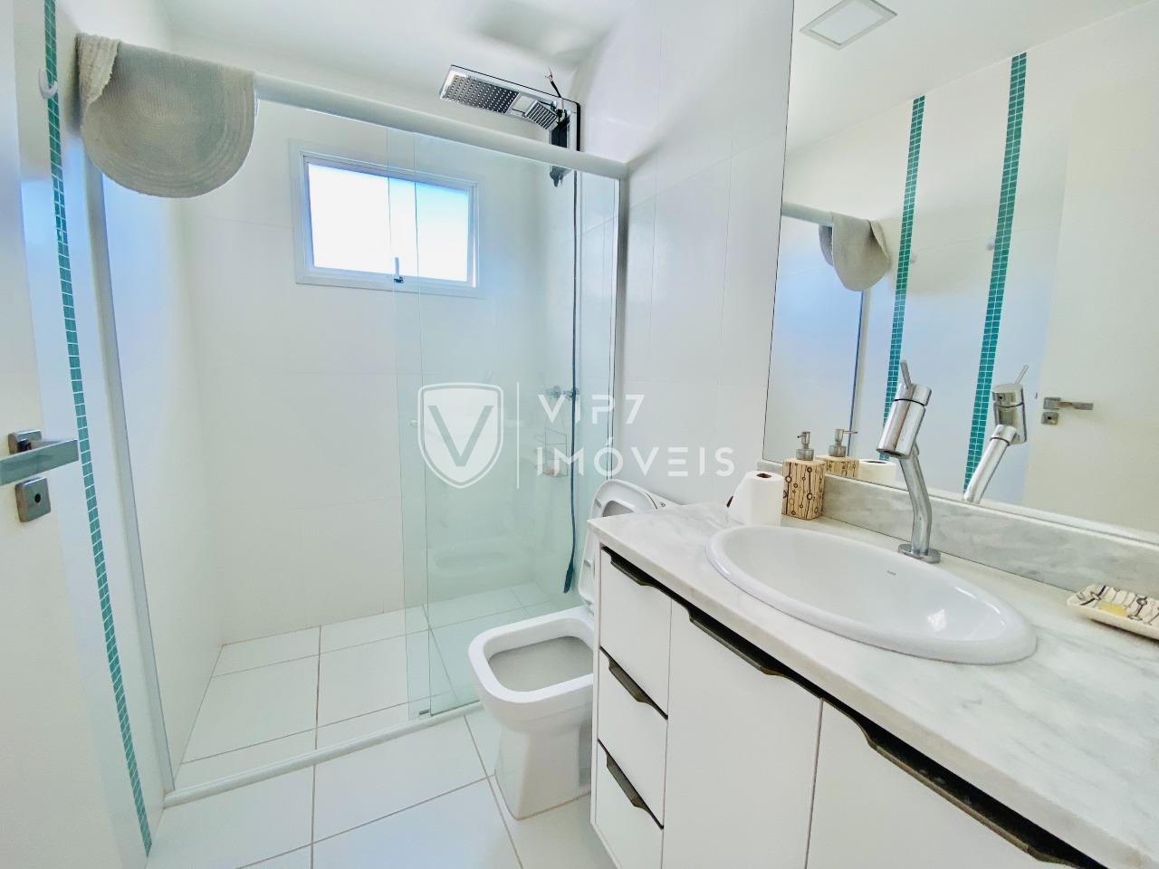 Acabamento refinado, incluindo banheiros com nichos e pias em Silestone, duchas e louças Deca de alto padrão.